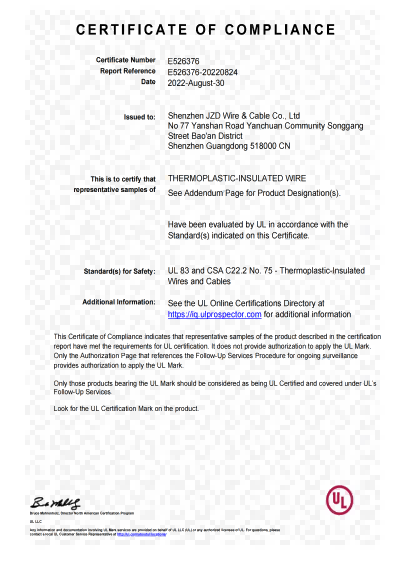 建圳達THHN美標UL尼龍電纜證書